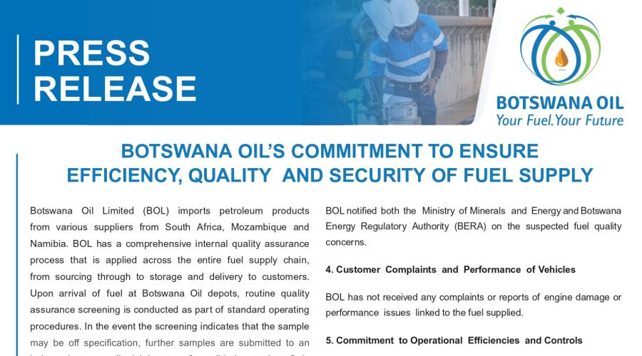 Botswana Oil Limited (BOL) imports petroleum products from various suppliers from South Africa, Mozambique and Namibia. BOL has a comprehensive internal quality assurance process that is applied across the entire fuel supply chain, from sourcing through to storage and delivery to customers.....READ MORE