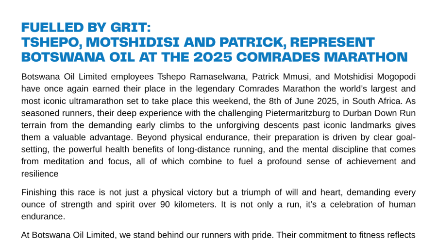 Botswana Oil employees Tshepo Ramaselwana, Patrick Mmusi and Motshidisi Mogopodi have once again earned their place in the Legendary Comrades Marathon the world's largest and most iconic ultramarathon set to take place this weekend, the 8th of June 2025 in South Africa......Read More